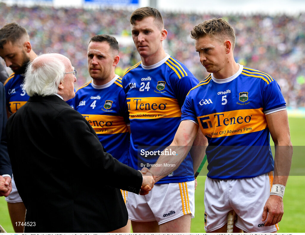 30 June 2019; President Michael D Higgins meets Brendan Maher of Tipperary prior to the Munster GAA Hurling Senior Championship Final match between Limerick and Tipperary at LIT Gaelic Grounds in Limerick. Photo by Brendan Moran/Sportsfile
