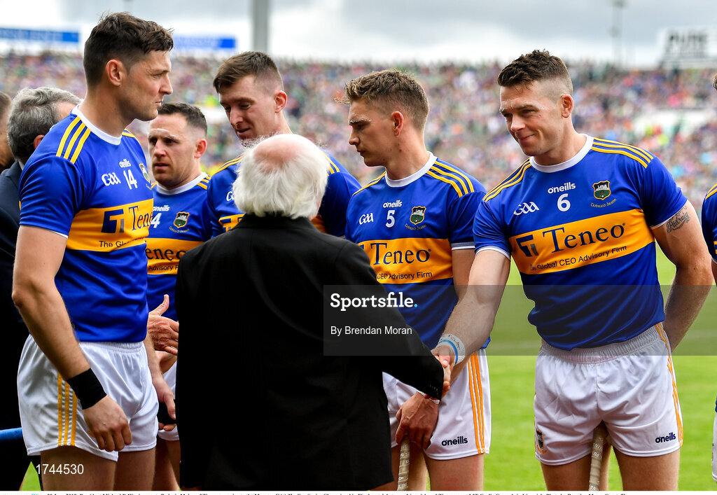 30 June 2019; President Michael D Higgins meets Padraic Maher of Tipperary prior to the Munster GAA Hurling Senior Championship Final match between Limerick and Tipperary at LIT Gaelic Grounds in Limerick. Photo by Brendan Moran/Sportsfile
