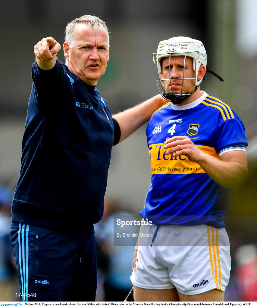30 June 2019; Tipperary coach and selector Eamon O'Shea with Seán O'Brien prior to the Munster GAA Hurling Senior Championship Final match between Limerick and Tipperary at LIT Gaelic Grounds in Limerick. Photo by Brendan Moran/Sportsfile
