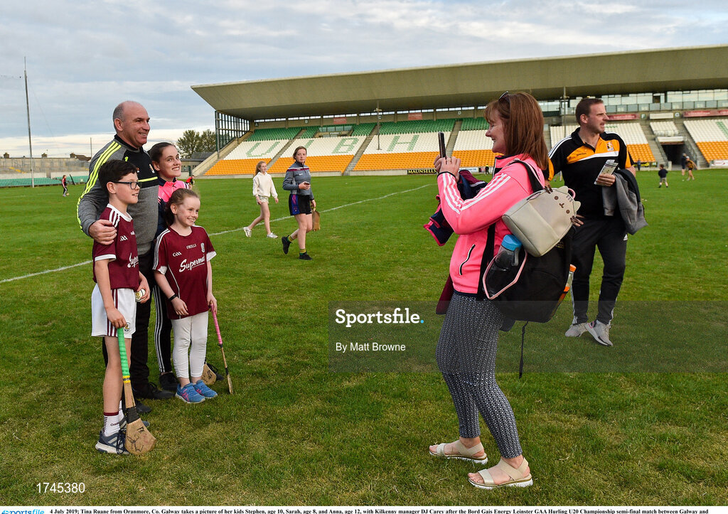4 July 2019; Tina Ruane from Oranmore, Co. Galway takes a picture of her kids Stephen, age 10, Sarah, age 8, and Anna, age 12, with Kilkenny manager DJ Carey after the Bord Gais Energy Leinster GAA Hurling U20 Championship semi-final match between Galway and Kilkenny at Bord na Mona O'Connor Park in Tullamore, Offaly. Photo by Matt Browne/Sportsfile