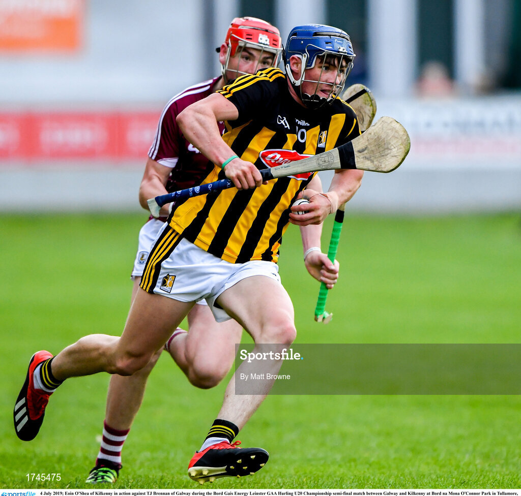 4 July 2019; Eoin O'Shea of Kilkenny in action against TJ Brennan of Galway during the Bord Gais Energy Leinster GAA Hurling U20 Championship semi-final match between Galway and Kilkenny at Bord na Mona O'Connor Park in Tullamore, Offaly. Photo by Matt Browne/Sportsfile