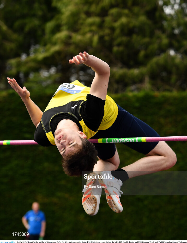6 July 2019; Ryan Carthy Walshe of Adamstown A.C., Co. Wexford, competing in the U23 High Jump event during the Irish Life Health Junior and U23 Outdoor Track and Field Championships at Tullamore Harriers Stadium, Tullamore in Offaly. Photo by Sam Barnes/Sportsfile