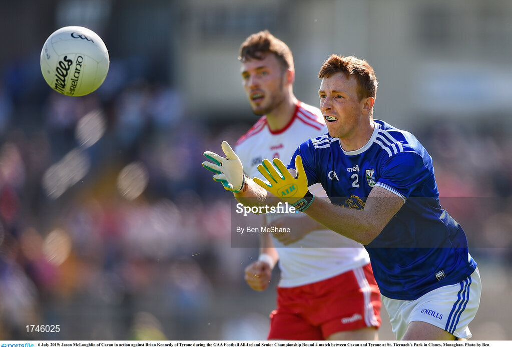 6 July 2019; Jason McLoughlin of Cavan in action against Brian Kennedy of Tyrone during the GAA Football All-Ireland Senior Championship Round 4 match between Cavan and Tyrone at St. Tiernach's Park in Clones, Monaghan. Photo by Ben McShane/Sportsfile