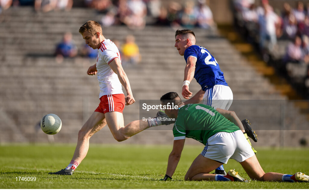 6 July 2019; Ben McDonnell of Tyrone shoots to score his side's first goal during the GAA Football All-Ireland Senior Championship Round 4 match between Cavan and Tyrone at St. Tiernach's Park in Clones, Monaghan. Photo by Ben McShane/Sportsfile