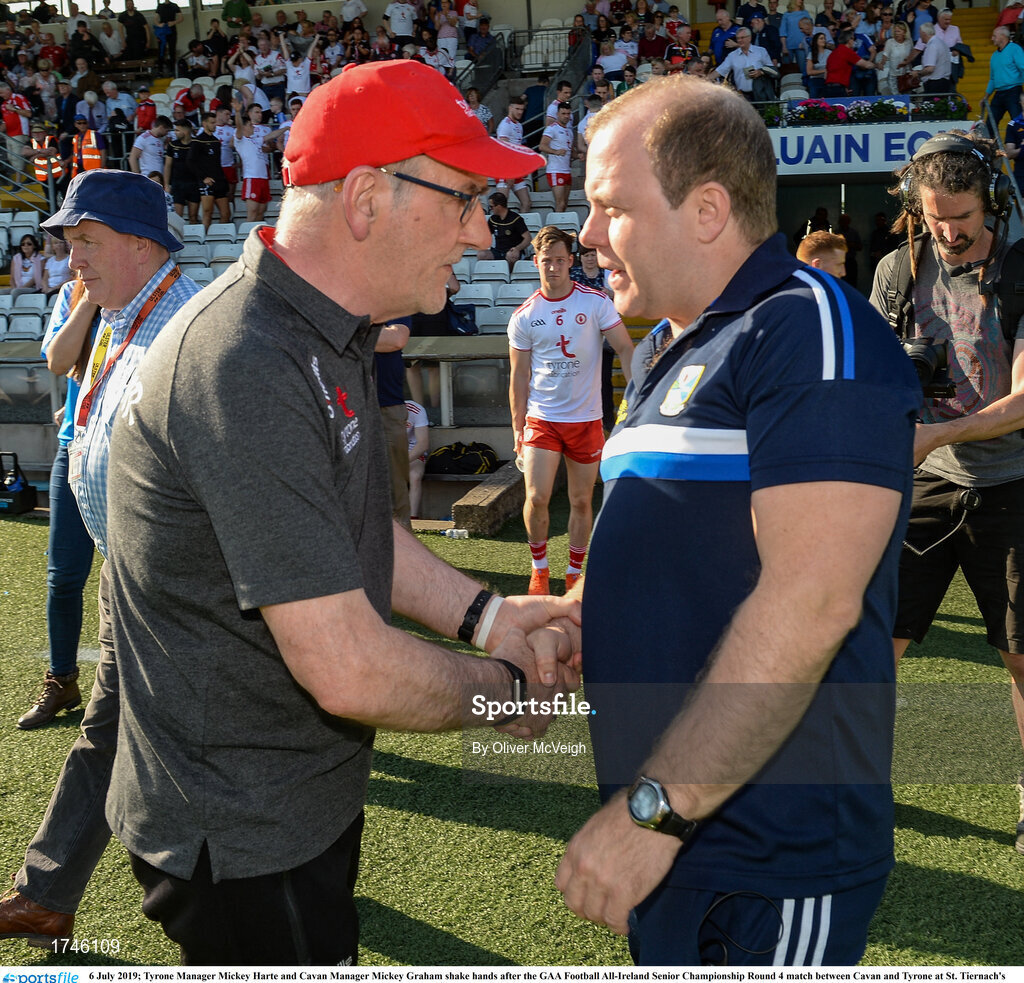 6 July 2019; Tyrone Manager Mickey Harte and Cavan Manager Mickey Graham shake hands after the GAA Football All-Ireland Senior Championship Round 4 match between Cavan and Tyrone at St. Tiernach's Park in Clones, Monaghan. Photo by Oliver McVeigh/Sportsfile