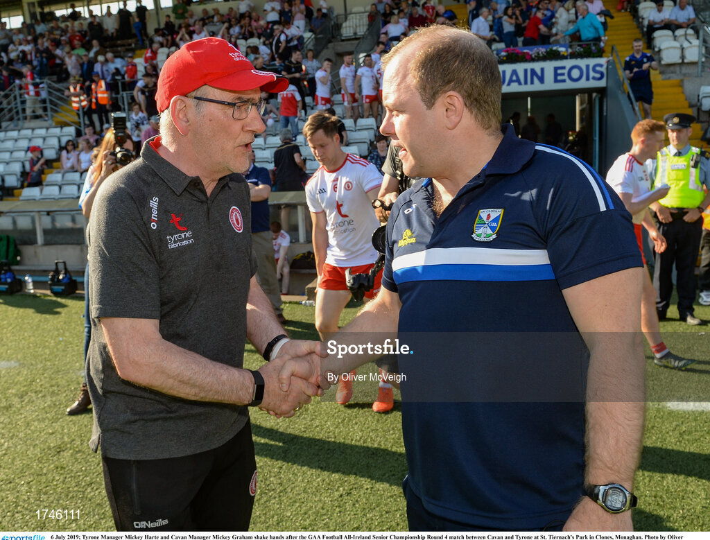 6 July 2019; Tyrone Manager Mickey Harte and Cavan Manager Mickey Graham shake hands after the GAA Football All-Ireland Senior Championship Round 4 match between Cavan and Tyrone at St. Tiernach's Park in Clones, Monaghan. Photo by Oliver McVeigh/Sportsfile