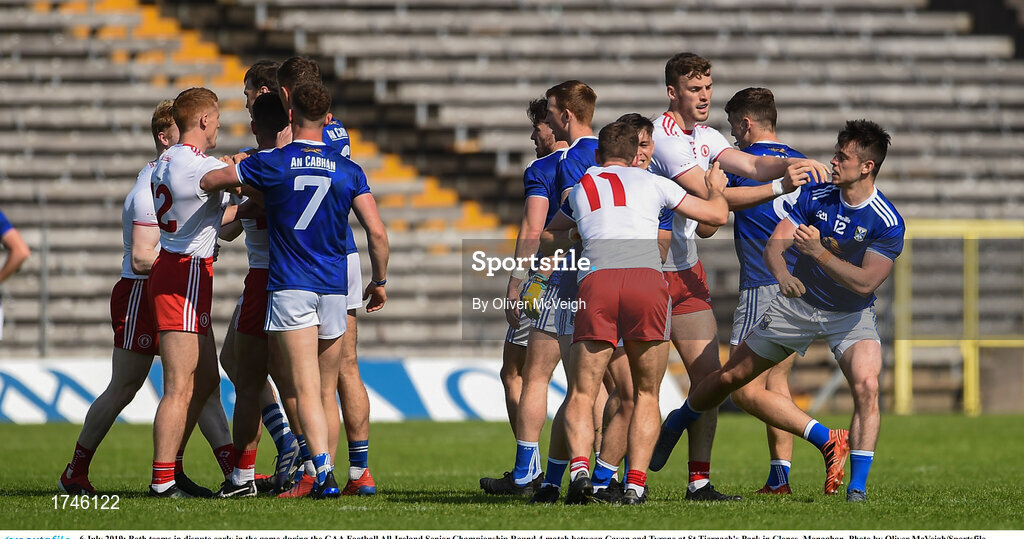6 July 2019; Both teams in dispute early in the game during the GAA Football All-Ireland Senior Championship Round 4 match between Cavan and Tyrone at St.Tiernach's Park in Clones, Monaghan. Photo by Oliver McVeigh/Sportsfile