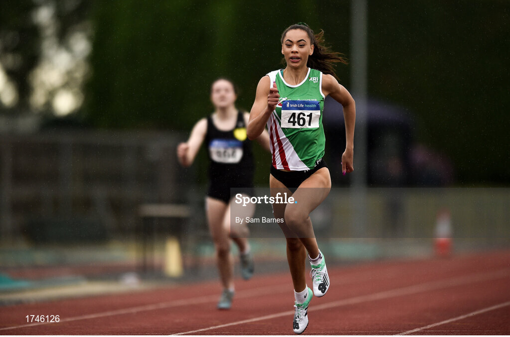 6 July 2019; Davicia Patterson of Beechmount Harriers, Co.Antrim, on her way to winning the Junior 200m during the Irish Life Health Junior and U23 Outdoor Track and Field Championships at Tullamore Harriers Stadium, Tullamore in Offaly. Photo by Sam Barnes/Sportsfile