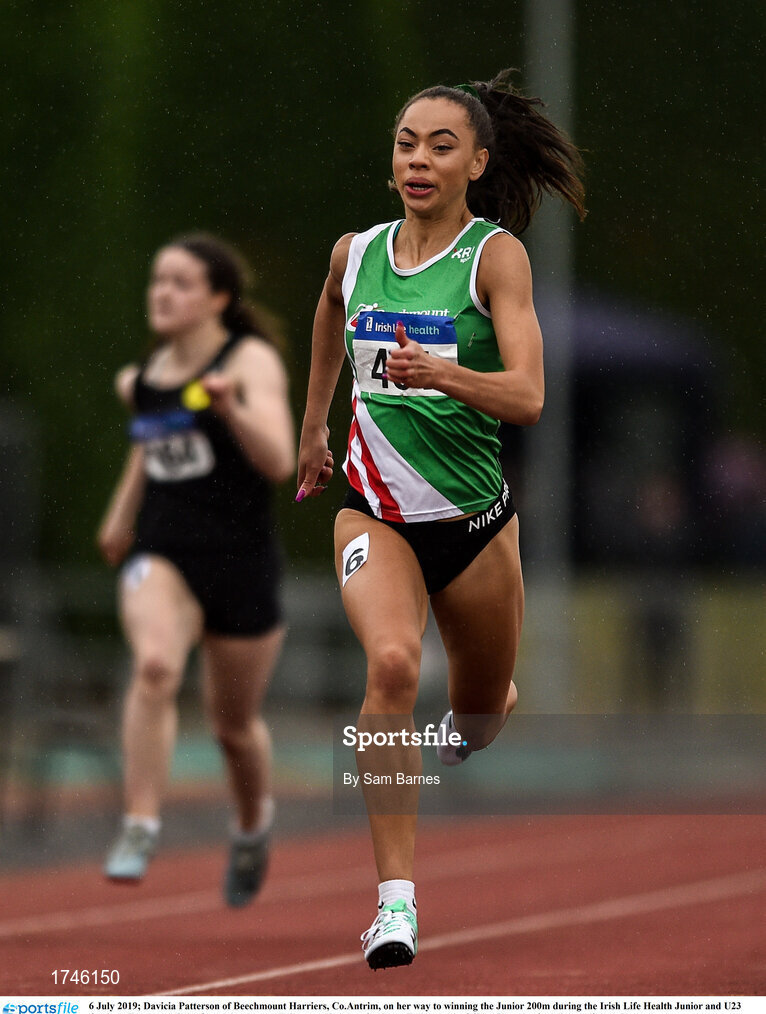 6 July 2019; Davicia Patterson of Beechmount Harriers, Co.Antrim, on her way to winning the Junior 200m during the Irish Life Health Junior and U23 Outdoor Track and Field Championships at Tullamore Harriers Stadium, Tullamore in Offaly. Photo by Sam Barnes/Sportsfile