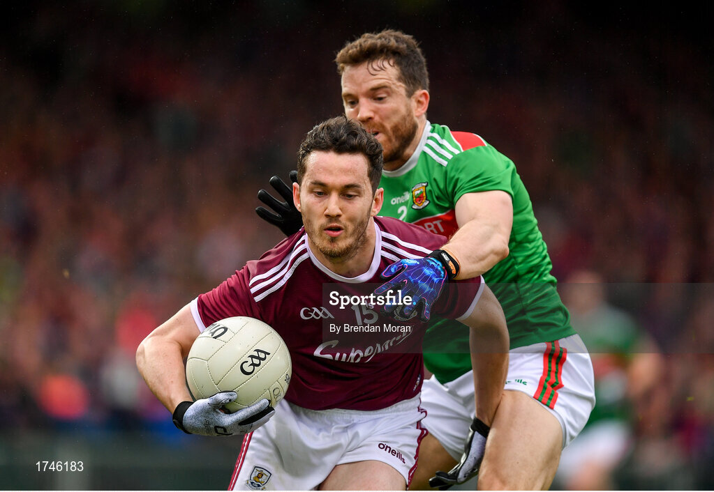 6 July 2019; Ian Burke of Galway is tackled by Chris Barrett of Mayo during the GAA Football All-Ireland Senior Championship Round 4 match between Galway and Mayo at the LIT Gaelic Grounds in Limerick. Photo by Brendan Moran/Sportsfile