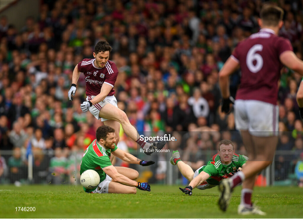 6 July 2019; Ian Burke of Galway is fouled by Chris Barrett of Mayo resulting in a penalty during the GAA Football All-Ireland Senior Championship Round 4 match between Galway and Mayo at the LIT Gaelic Grounds in Limerick. Photo by Eóin Noonan/Sportsfile