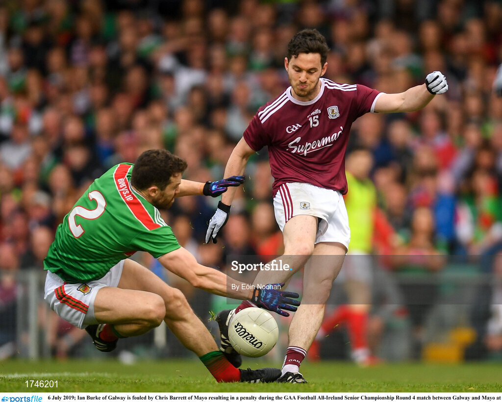 6 July 2019; Ian Burke of Galway is fouled by Chris Barrett of Mayo resulting in a penalty during the GAA Football All-Ireland Senior Championship Round 4 match between Galway and Mayo at the LIT Gaelic Grounds in Limerick. Photo by Eóin Noonan/Sportsfile