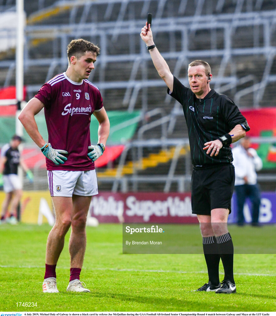 6 July 2019; Michael Daly of Galway is shown a black card by referee Joe McQuillan during the GAA Football All-Ireland Senior Championship Round 4 match between Galway and Mayo at the LIT Gaelic Grounds in Limerick. Photo by Brendan Moran/Sportsfile