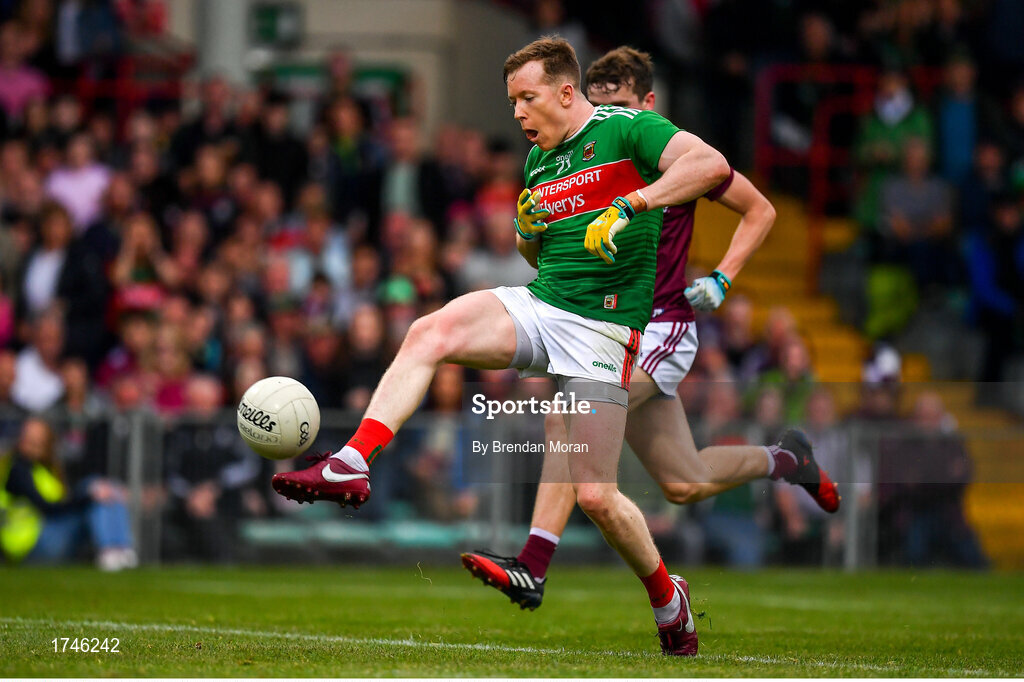 6 July 2019; Donal Vaughan of Mayo kicks a late point during the GAA Football All-Ireland Senior Championship Round 4 match between Galway and Mayo at the LIT Gaelic Grounds in Limerick. Photo by Brendan Moran/Sportsfile