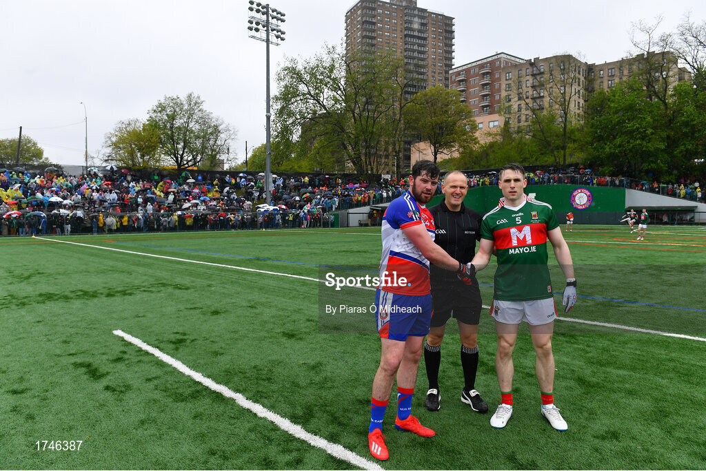 5 May 2019; Referee Conor Lane with team captains Niall Madine of New York and Paddy Durcan of Mayo before the Connacht GAA Football Senior Championship Quarter-Final match between New York and Mayo at Gaelic Park in New York, USA. Photo by Piaras Ó Mídheach/Sportsfile