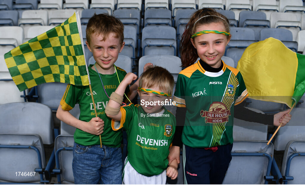 7 July 2019; Meath supporters from left, Conor Mulchrone, aged 8, Charlie Mulchrone, aged 5, and Caoimhe Mulchrone, aged 10, from Navan, Co. Meath, during the GAA Football All-Ireland Senior Championship Round 4 match between Meath and Clare at O’Moore Park in Portlaoise, Laois. Photo by Sam Barnes/Sportsfile