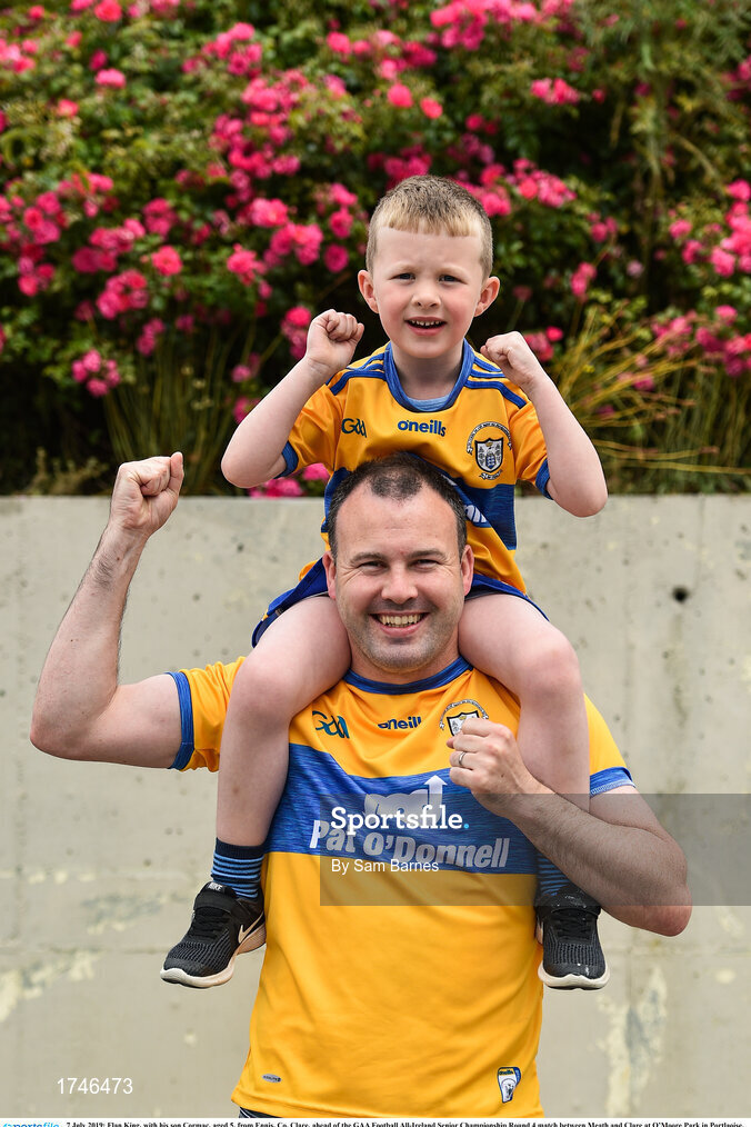7 July 2019; Flan King, with his son Cormac, aged 5, from Ennis, Co. Clare, ahead of the GAA Football All-Ireland Senior Championship Round 4 match between Meath and Clare at O’Moore Park in Portlaoise, Laois. Photo by Sam Barnes/Sportsfile
