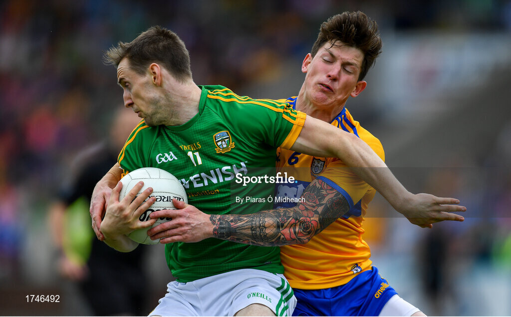 7 July 2019; Bryan McMahon of Meath in action against Aaron Fitzgerald of Clare during the GAA Football All-Ireland Senior Championship Round 4 match between Meath and Clare at O’Moore Park in Portlaoise, Laois. Photo by Piaras Ó Mídheach/Sportsfile