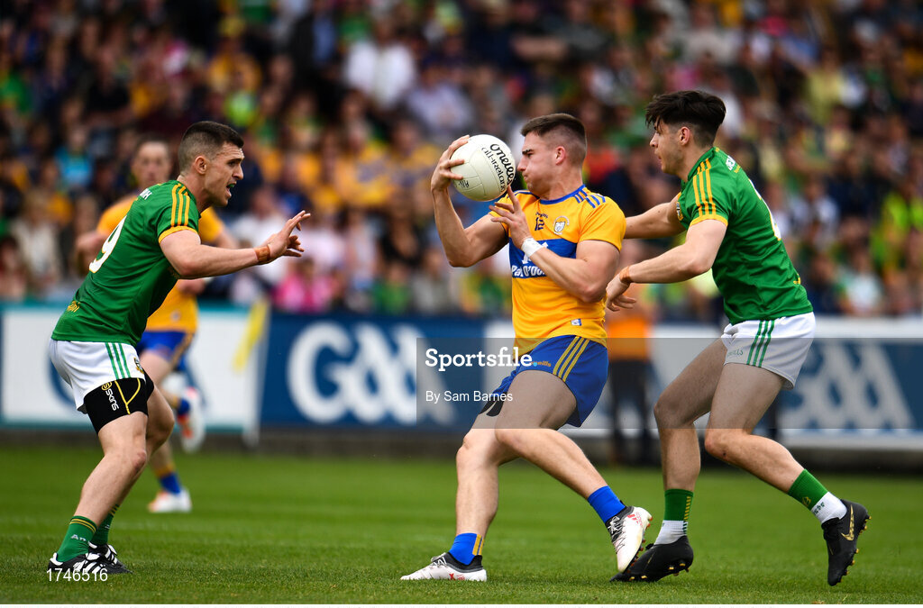 7 July 2019; Jamie Malone of Clare in action against Séamus Lavin, right, and Shane McEntee of Meath during the GAA Football All-Ireland Senior Championship Round 4 match between Meath and Clare at O’Moore Park in Portlaoise, Laois. Photo by Sam Barnes/Sportsfile