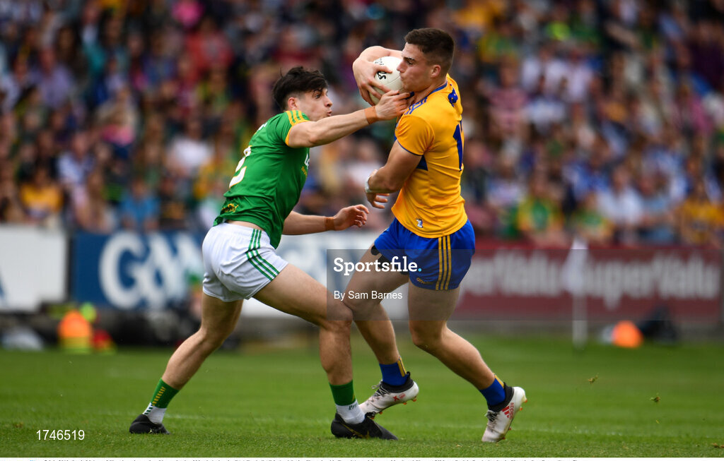 7 July 2019; Jamie Malone of Clare in action against Séamus Lavin of Meath during the GAA Football All-Ireland Senior Championship Round 4 match between Meath and Clare at O’Moore Park in Portlaoise, Laois. Photo by Sam Barnes/Sportsfile