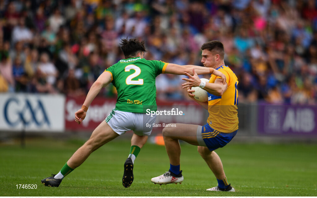 7 July 2019; Jamie Malone of Clare in action against Séamus Lavin of Meath during the GAA Football All-Ireland Senior Championship Round 4 match between Meath and Clare at O’Moore Park in Portlaoise, Laois. Photo by Sam Barnes/Sportsfile