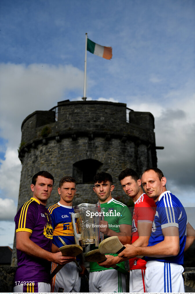 9 July 2019; In attendance at the GAA Hurling All Ireland Senior Championship Series National Launch at King John's Castle in Limerick are, from left, Kevin Foley of Wexford, Brendan Maher of Tipperary, Aaron Gillane of Limerick, Seamus Harnedy of Cork and Joe Phelan of Laois. Photo by Brendan Moran/Sportsfile