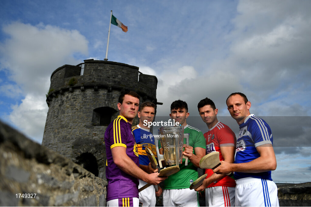 9 July 2019; In attendance at the GAA Hurling All Ireland Senior Championship Series National Launch at King John's Castle in Limerick are, from left, Kevin Foley of Wexford, Brendan Maher of Tipperary, Aaron Gillane of Limerick, Seamus Harnedy of Cork and Joe Phelan of Laois. Photo by Brendan Moran/Sportsfile