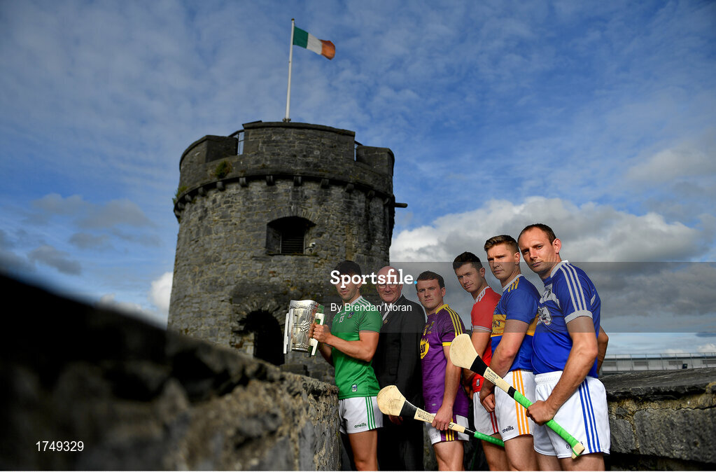 9 July 2019; In attendance at the GAA Hurling All Ireland Senior Championship Series National Launch at King John's Castle in Limerick are, from left, Kevin Foley of Wexford, Uachtaráin Cumann Lúthchleas Gael John Horan, Joe Phelan of Laois, Brendan Maher of Tipperary, Aaron Gillane of Limerick and Seamus Harnedy of Cork. Photo by Brendan Moran/Sportsfile