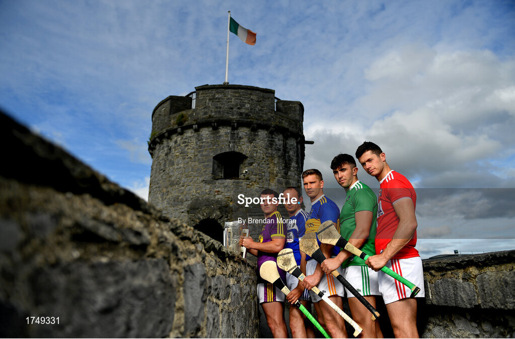 9 July 2019; In attendance at the GAA Hurling All Ireland Senior Championship Series National Launch at King John's Castle in Limerick are, from left, Kevin Foley of Wexford, Joe Phelan of Laois, Brendan Maher of Tipperary, Aaron Gillane of Limerick and Seamus Harnedy of Cork. Photo by Brendan Moran/Sportsfile