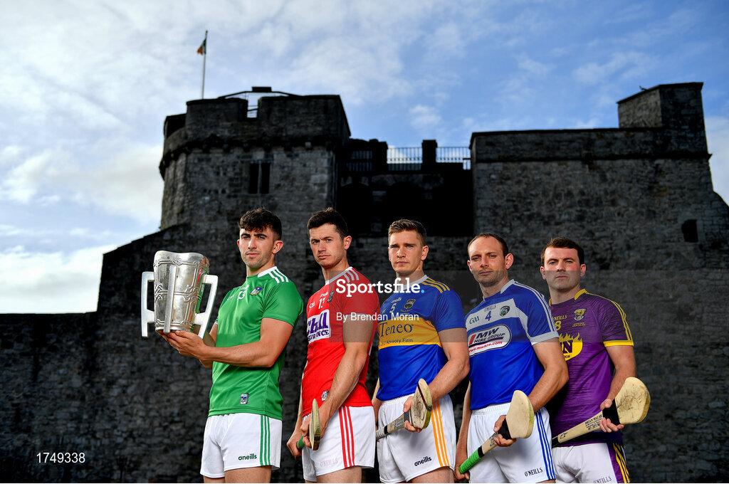 9 July 2019; In attendance at the GAA Hurling All Ireland Senior Championship Series National Launch at King John's Castle in Limerick are, from left, Aaron Gillane of Limerick, Seamus Harnedy of Cork, Brendan Maher of Tipperary, Joe Phelan of Laois and Kevin Foley of Wexford. Photo by Brendan Moran/Sportsfile