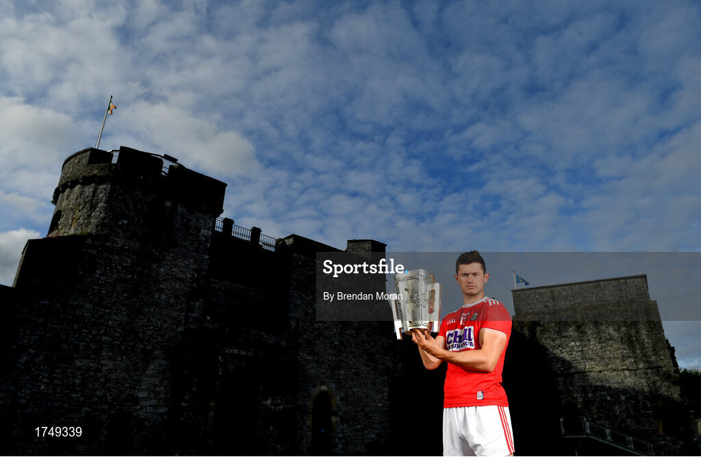 9 July 2019; Seamus Harnedy of Cork poses for a portrait with the Liam MacCarthy Cup during the GAA Hurling All Ireland Senior Championship Series National launch at King John’s Castle in Limerick. Photo by Brendan Moran/Sportsfile
