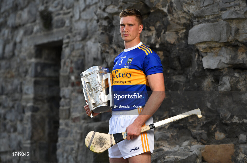 9 July 2019; Brendan Maher of Tipperary poses for a portrait with the Liam MacCarthy Cup during the GAA Hurling All Ireland Senior Championship Series National launch at King John’s Castle in Limerick. Photo by Brendan Moran/Sportsfile