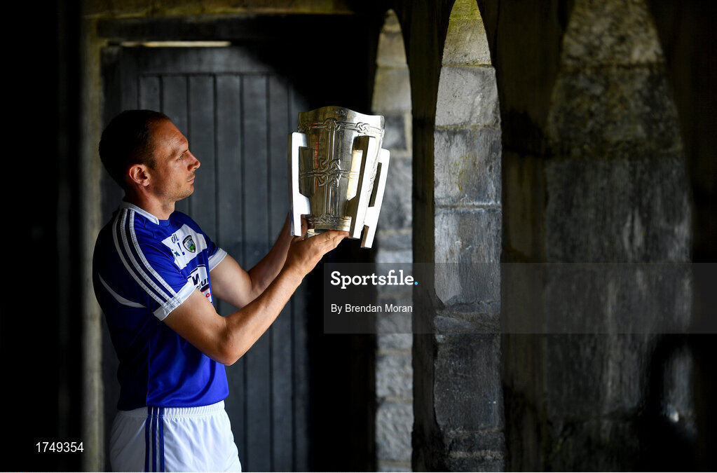 9 July 2019; Joe Phelan of Laois poses for a portrait with the Liam MacCarthy Cup during the GAA Hurling All Ireland Senior Championship Series National launch at King John’s Castle in Limerick. Photo by Brendan Moran/Sportsfile