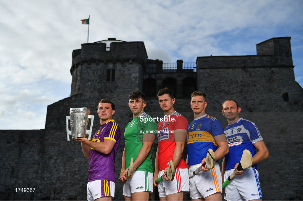 9 July 2019; In attendance at the GAA Hurling All Ireland Senior Championship Series National Launch at King John's Castle in Limerick are, from left, Kevin Foley of Wexford, Aaron Gillane of Limerick, Seamus Harnedy of Cork, Brendan Maher of Tipperary and Joe Phelan of Laois. Photo by Brendan Moran/Sportsfile