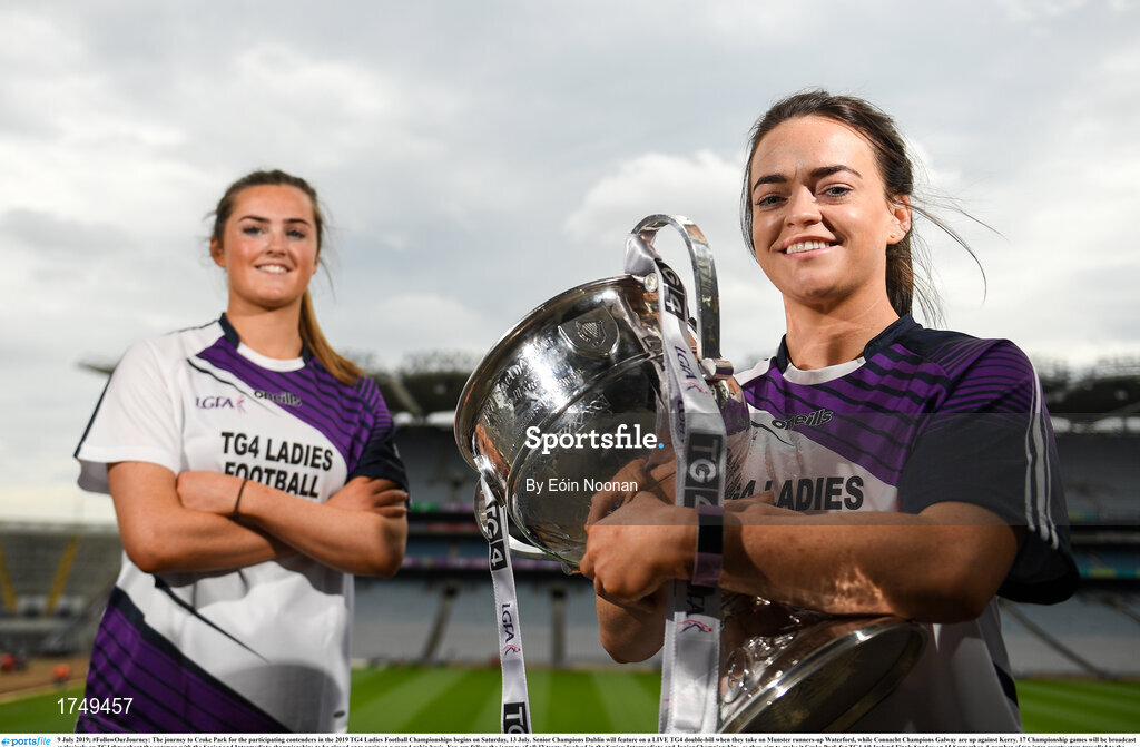 9 July 2019; #FollowOurJourney: The journey to Croke Park for the participating contenders in the 2019 TG4 Ladies Football Championships begins on Saturday, 13 July. Senior Champions Dublin will feature on a LIVE TG4 double-bill when they take on Munster runners-up Waterford, while Connacht Champions Galway are up against Kerry. 17 Championship games will be broadcast exclusively on TG4 throughout the summer, with the Senior and Intermediate championships to be played once again on a round-robin basis. You can follow the journey of all 32 teams involved in the Senior, Intermediate and Junior Championships, as they aim to make it Croke Park for TG4 All-Ireland Finals Sunday on 15 September. A number of top inter-county stars travelled to the spectacular Ballynahinch Castle Hotel in county Galway to mark the beginning of the TG4 All-Ireland series. Pictured are Aimee Mackin of Armagh and Sinead Greene of Cavan with the Brendan Martin Cup at the launch at Croke Park in Dublin. #ProperFan. Photo by Eóin Noonan/Sportsfile