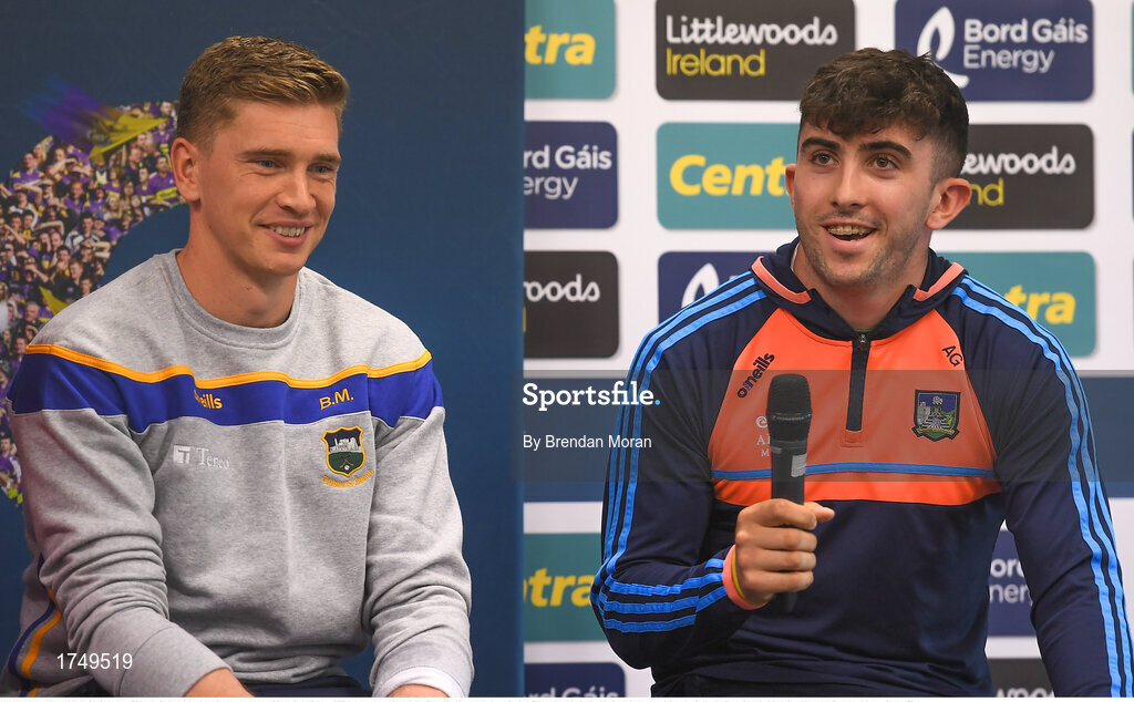 9 July 2019; Aaron Gillane of Limerick, right, in the company of Brendan Maher of Tipperary, speaking at the GAA Hurling All Ireland Senior Championship Series National Launch at Mungret St Pauls GAA Club in Limerick. Photo by Brendan Moran/Sportsfile