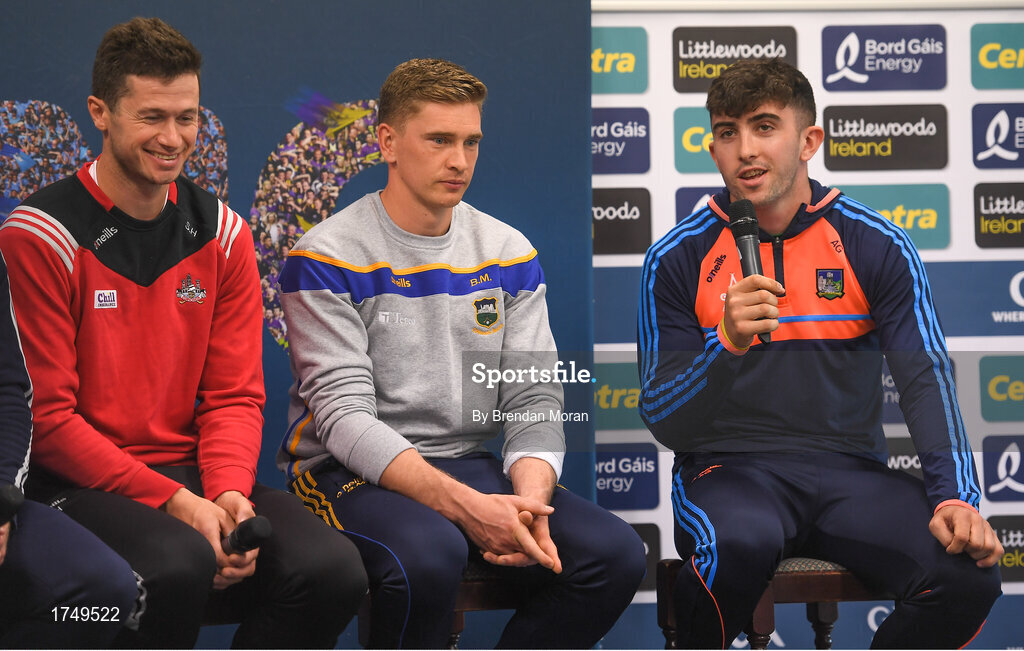 9 July 2019; Aaron Gillane of Limerick, right, in the company of Brendan Maher of Tipperary and Seamus Harnedy of Cork, speaking at the GAA Hurling All Ireland Senior Championship Series National Launch at Mungret St Pauls GAA Club in Limerick. Photo by Brendan Moran/Sportsfile