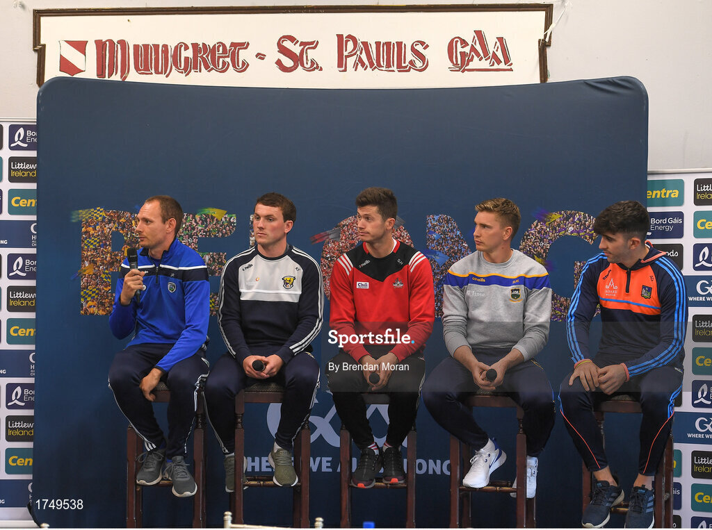 9 July 2019; Joe Phelan of Laois, left, in the company of Kevin Foley of Wexford, Seamus Harnedy of Cork, Brendan Maher of Tipperary and Aaron Gillane of Limerick, speaking at the GAA Hurling All Ireland Senior Championship Series National Launch at Mungret St Pauls GAA Club in Limerick. Photo by Brendan Moran/Sportsfile