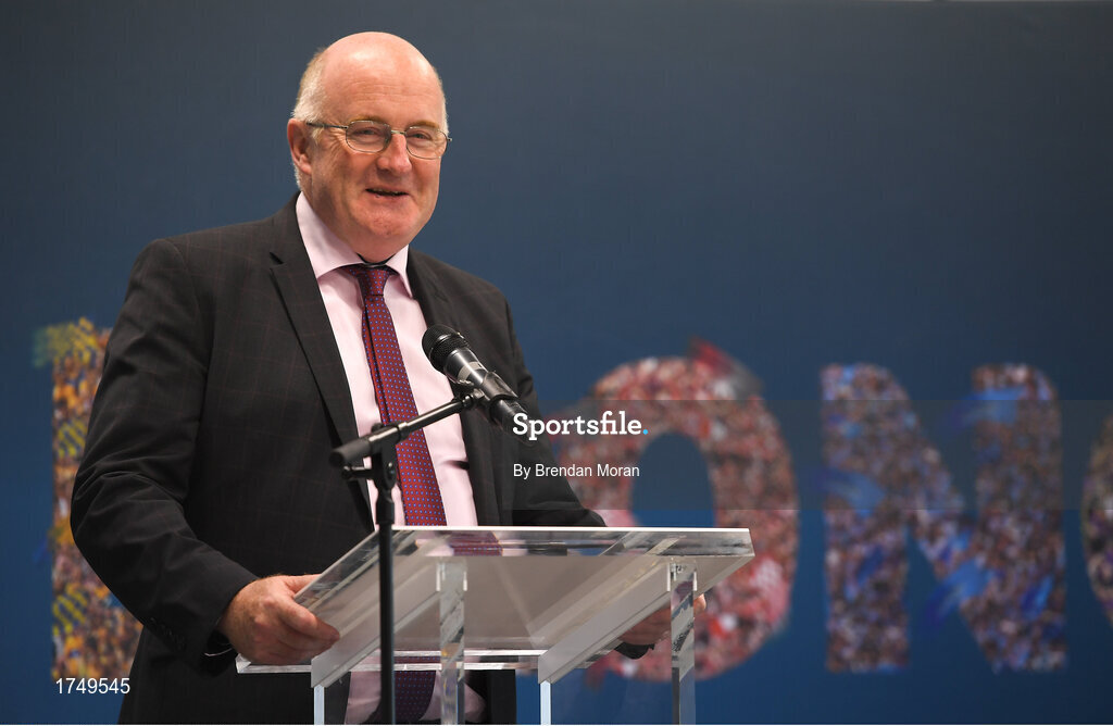9 July 2019; Uachtaráin Cumann Lúthchleas Gael John Horan speaking at the GAA Hurling All Ireland Senior Championship Series National Launch at Mungret St Pauls GAA Club in Limerick. Photo by Brendan Moran/Sportsfile