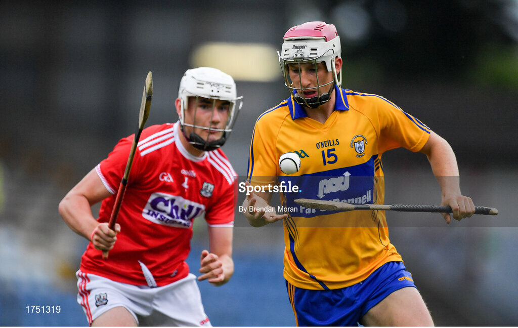 10 July 2019; Breffni Horner of Clare in action against Eoin Roche of Cork during the Bord Gais Energy Munster GAA Hurling Under 20 Championship semi-final match between Cork and Clare at Páirc Ui Rinn in Cork. Photo by Brendan Moran/Sportsfile