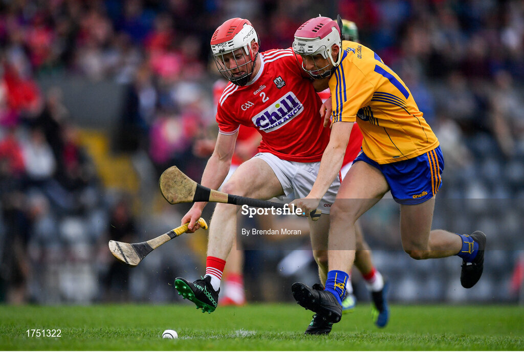 10 July 2019; Breffni Horner of Clare in action against Eoin Roche of Cork during the Bord Gais Energy Munster GAA Hurling Under 20 Championship semi-final match between Cork and Clare at Páirc Ui Rinn in Cork. Photo by Brendan Moran/Sportsfile