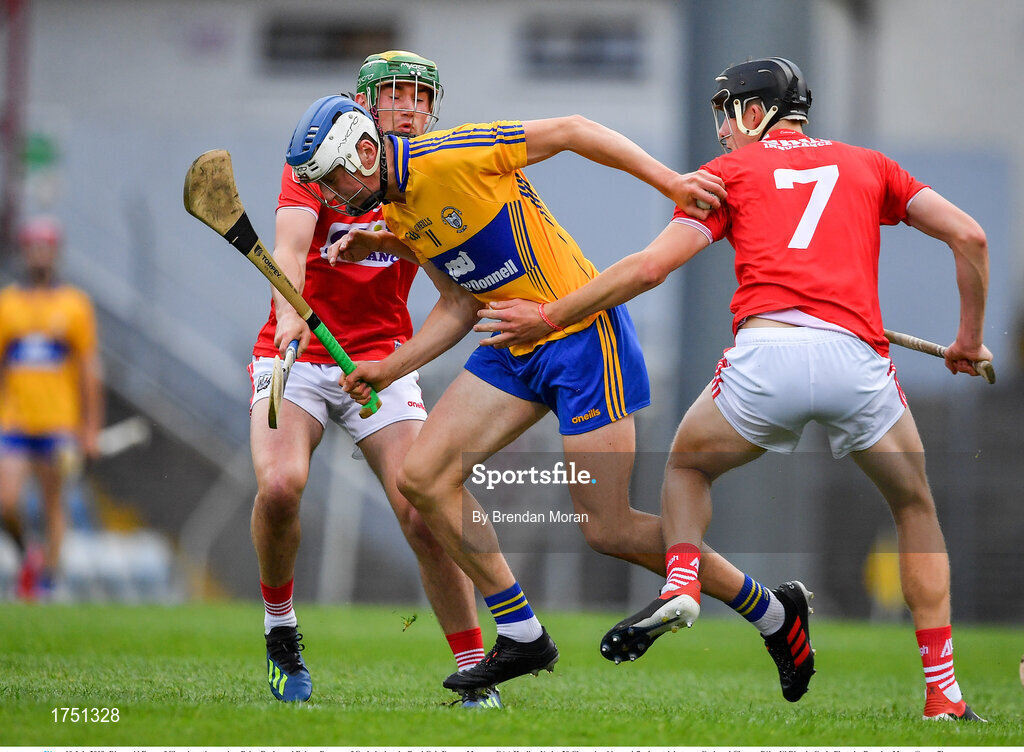 10 July 2019; Diarmuid Ryan of Clare in action against Brian Roche and Robert Downey of Cork during the Bord Gais Energy Munster GAA Hurling Under 20 Championship semi-final match between Cork and Clare at Páirc Ui Rinn in Cork. Photo by Brendan Moran/Sportsfile