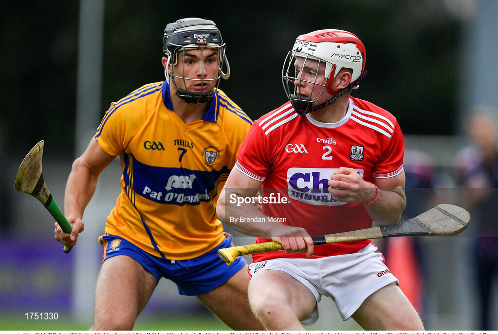 10 July 2019; Conor O’Callaghan of Cork in action against Dylan McMahon? of Clare during the Bord Gais Energy Munster GAA Hurling Under 20 Championship semi-final match between Cork and Clare at Páirc Ui Rinn in Cork. Photo by Brendan Moran/Sportsfile