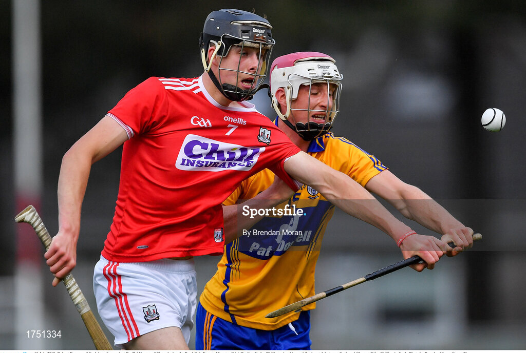 10 July 2019; Robert Downey of Cork in action against Breffni Horner of Clare during the Bord Gais Energy Munster GAA Hurling Under 20 Championship semi-final match between Cork and Clare at Páirc Ui Rinn in Cork. Photo by Brendan Moran/Sportsfile