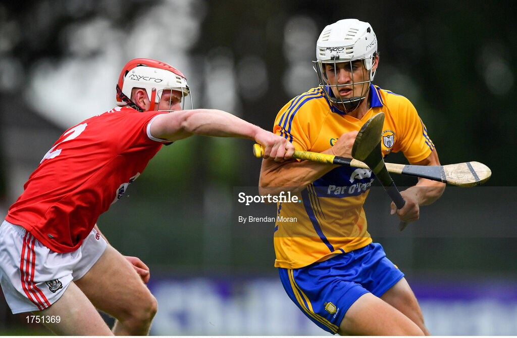 10 July 2019; Aidan McCarthy of Clare in action against Conor O’Callaghan of Cork during the Bord Gais Energy Munster GAA Hurling Under 20 Championship semi-final match between Cork and Clare at Páirc Ui Rinn in Cork. Photo by Brendan Moran/Sportsfile