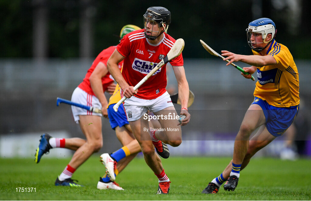 10 July 2019; Robert Downey of Cork in action against Diarmuid Ryan of Clare during the Bord Gais Energy Munster GAA Hurling Under 20 Championship semi-final match between Cork and Clare at Páirc Ui Rinn in Cork. Photo by Brendan Moran/Sportsfile