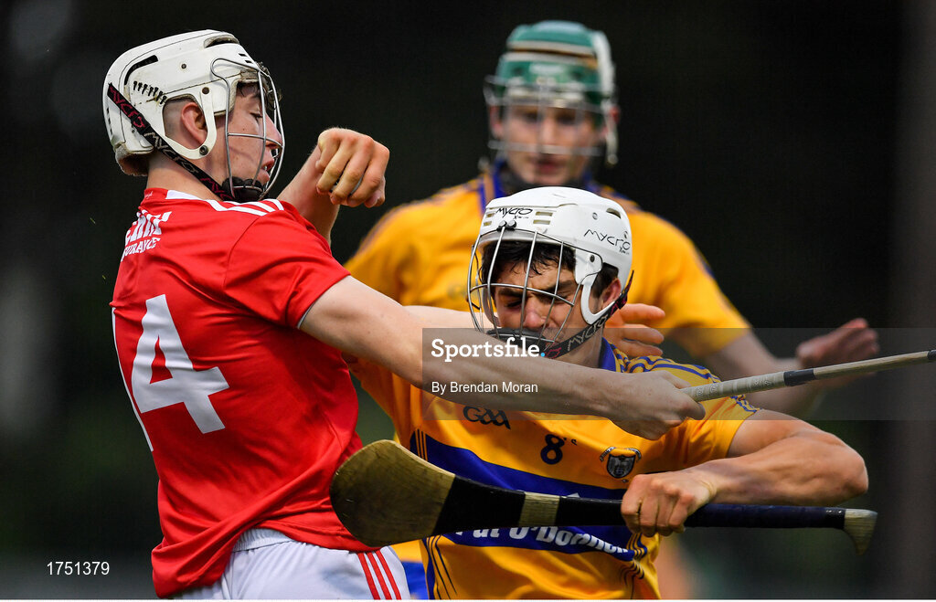 10 July 2019; Aidan McCarthy of Clare is tackled by Shane O’Regan of Cork during the Bord Gais Energy Munster GAA Hurling Under 20 Championship semi-final match between Cork and Clare at Páirc Ui Rinn in Cork. Photo by Brendan Moran/Sportsfile