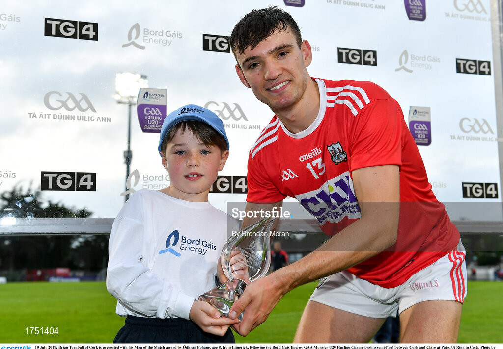 10 July 2019; Brian Turnbull of Cork is presented with his Man of the Match award by Ódhran Bohane, age 8, from Limerick, following the Bord Gais Energy GAA Munster U20 Hurling Championship semi-final between Cork and Clare at Páirc Uí Rinn in Cork. Photo by Brendan Moran/Sportsfile