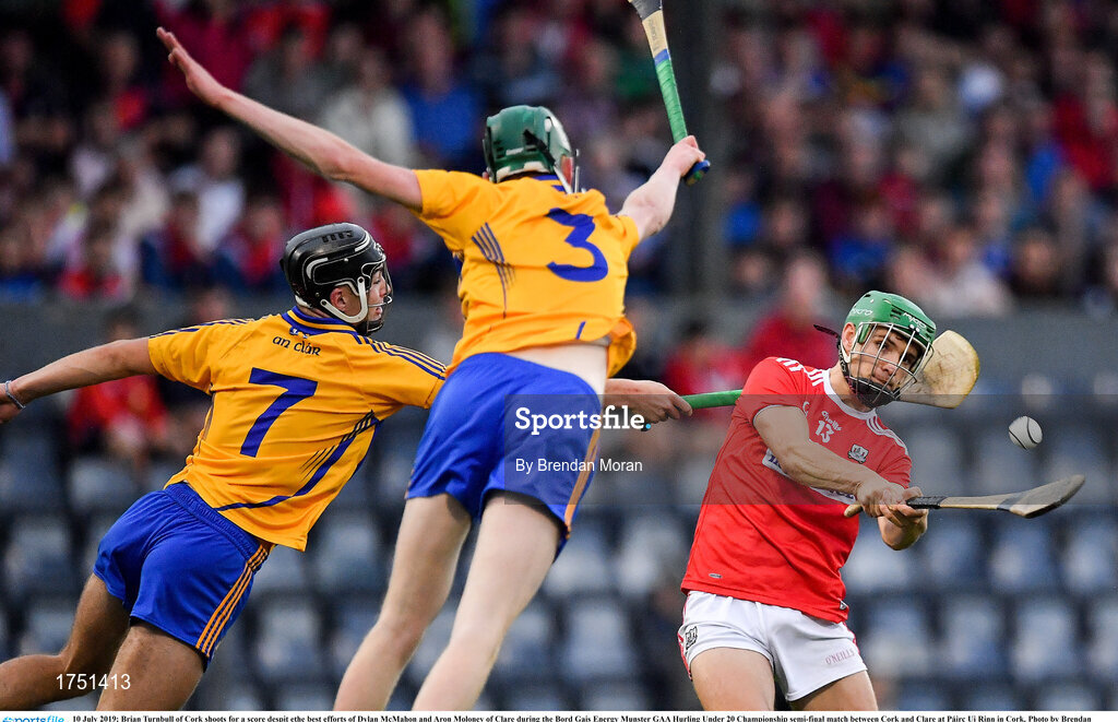 10 July 2019; Brian Turnbull of Cork shoots for a score despit ethe best efforts of Dylan McMahon? and Aron Moloney of Clare during the Bord Gais Energy Munster GAA Hurling Under 20 Championship semi-final match between Cork and Clare at Páirc Ui Rinn in Cork. Photo by Brendan Moran/Sportsfile