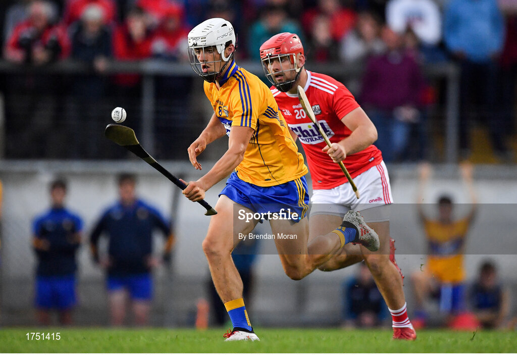 10 July 2019; Aidan McCarthy of Clare in action against Declan Hanlon of Cork during the Bord Gais Energy Munster GAA Hurling Under 20 Championship semi-final match between Cork and Clare at Páirc Ui Rinn in Cork. Photo by Brendan Moran/Sportsfile